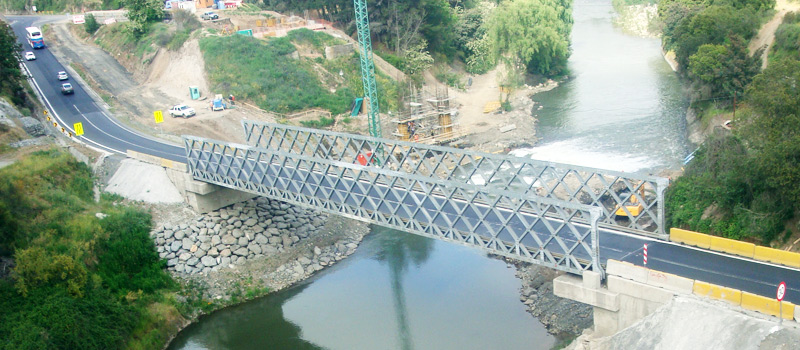 DESCRIPCIÓN: La infraestructura del puente provisorio mecano se compone por 2 estribos, estructurado mediante pilas-pilotes, de diámetro 1.50 m, la cual sirve de apoyo para un tramo de puente mecano para 2 vías de circulación.